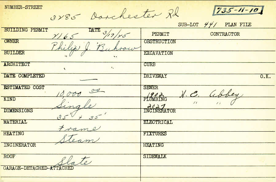 3285 Dorchester Road Shaker Heights, OH 44120 PARCEL ID: 735-11-010 Building Permit Date: 03-17-1925 Plan File Number: 0 Neighborhood: Fernway Owner: Buhrow, Philip J. Builder: Buhrow, Philip J. Architect: Buhrow, Philip J. Estimated Cost: 10000 Kind: Single, Single Residence or Dwelling Material: Frame Heating: Steam Roof: Slate Card Available: yes |