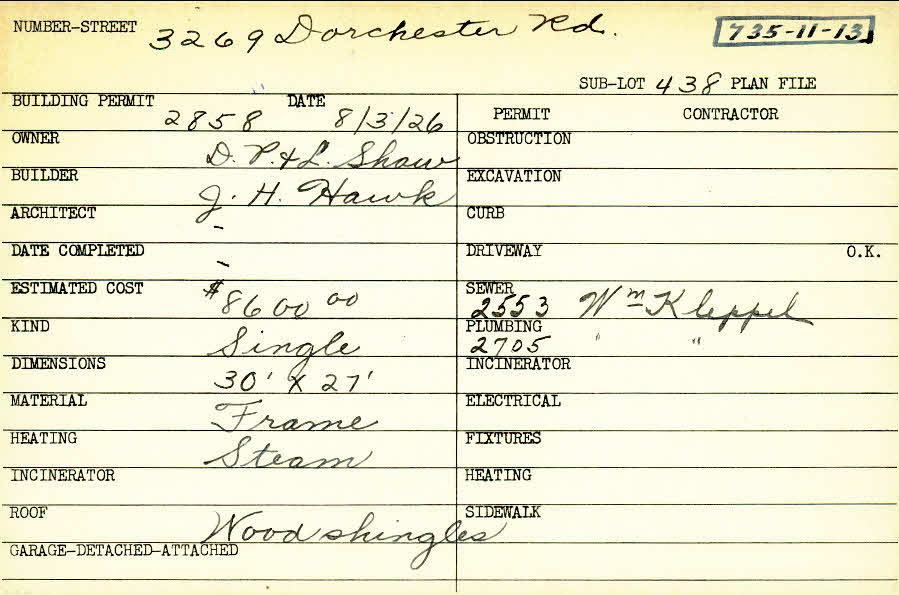 3269 Dorchester Road Shaker Heights, OH 44120 PARCEL ID: 735-11-013 Building Permit Date: 08-03-1926 Plan File Number: 0 Neighborhood: Fernway Owner: Shaw, D. P. and L. Builder: Hawk, J. H. Estimated Cost: 8600 Kind: Single, Single Residence or Dwelling Material: Frame Heating: Steam Roof: Wood Shingle |