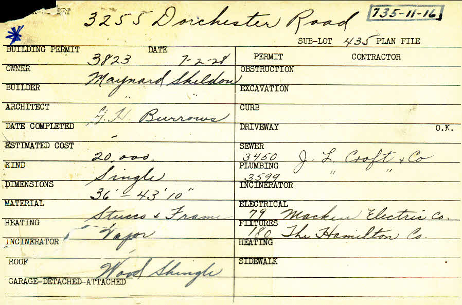 3255 Dorchester Road Shaker Heights, OH 44120 PARCEL ID: 735-11-016 Building Permit Date: 07-02-1928 Plan File Number: 0 Neighborhood: Fernway Owner: Sheldon, Maynard Builder: Sheldon, Maynard Architect: Burrows, George H. Estimated Cost: 20000 Kind: Single, Single Residence or Dwelling Material: Stucco and Frame Heating: Vapor Roof: Wood Shingle Card Available: yes |