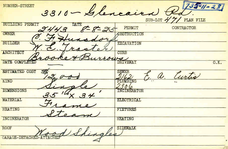 3310 Glencairn Road Shaker Heights, OH 44122 PARCEL ID: 735-11-028 Building Permit Date: 08-08-1925 Neighborhood: Fernway Owner: Hunsdorf, C. F. Builder: Traster, W. E. Architect: Brooke and Burrows Estimated Cost: 12000 Kind: Single, Single Residence or Dwelling Material: Frame Heating: Steam Roof: Wood Shingle Blueprints: no blueprints on microfilm |