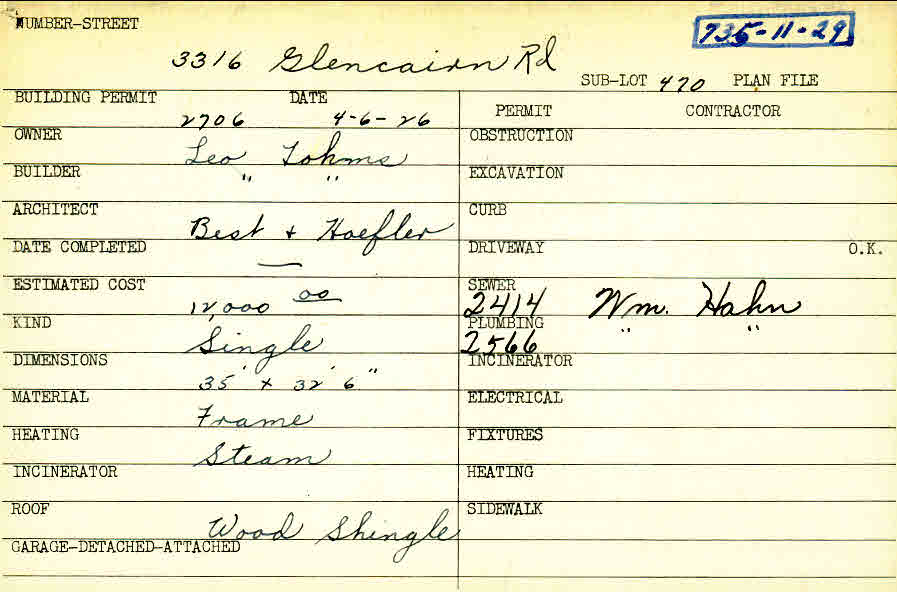 3316 Glencairn Road Shaker Heights, OH 44122 PARCEL ID: 735-11-029 Building Permit Date: 04-06-1926 Plan File Number: 9959 Microfilm Roll: Roll#105 Neighborhood: Fernway Owner: Tohms, Leo Builder: Tohms, Leo Architect: Best and Hoefler Estimated Cost: 12000 Kind: Single, Single Residence or Dwelling Material: Frame Heating: Steam Roof: Wood Shingle |