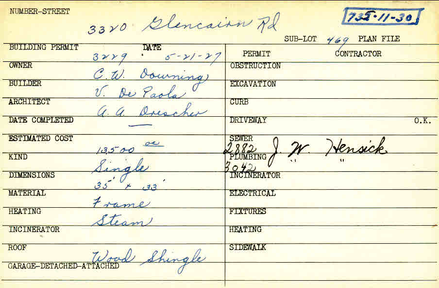 3320 Glencairn Road Shaker Heights, OH 44122 PARCEL ID: 735-11-030 Building Permit Date: 05-21-1927 Plan File Number: 0 Neighborhood: Fernway Owner: Downing, C. W. Builder: DePaola. V. Architect: Drescher, A. A. Estimated Cost: 13500 Kind: Single, Single Residence or Dwelling Material: Frame Heating: Steam Roof: Wood Shingle Card Available: yes |