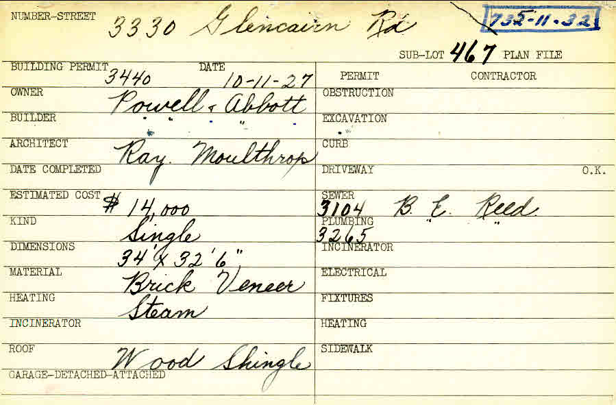 3330 Glencairn Road Shaker Heights, OH 44122 PARCEL ID: 735-11-032 Building Permit Date: 10-11-1927 Plan File Number: 10511 Microfilm Roll: NewRoll#4 Neighborhood: Fernway Owner: Powell and Abbott Builder: Powell and Abbott Architect: Moulthrop, Ray Estimated Cost: 14000 Kind: Single, Single Residence or Dwelling Material: Brick Veneer Heating: Steam Roof: Wood Shingle |