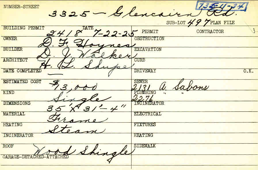 3325 Glencairn Road Shaker Heights, OH 44122 PARCEL ID: 735-11-034 Building Permit Date: 07-22-1925 Plan File Number: 1371 scanned, 7024 Microfilm Roll: Roll016, Roll#90 Neighborhood: Fernway Owner: Hoynes, D. F. Builder: Walker, D. J. Architect: Shupe, H. L. Estimated Cost: 13000 Kind: Single, Single Residence or Dwelling Material: Frame Heating: Steam Roof: Wood Shingle |