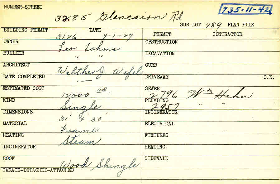3285 Glencairn Road Shaker Heights, OH 44122 PARCEL ID: 735-11-042 Building Permit Date: 04-01-1927 Plan File Number: 0 Neighborhood: Fernway Owner: Tohms, Leo Builder: Tohms, Leo Architect: Wefel, Walther J. Estimated Cost: 12000 Kind: Single, Single Residence or Dwelling Material: Frame Heating: Steam Roof: Wood Shingle |
