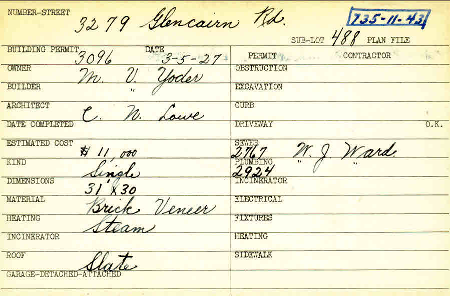 3279 Glencairn Road Shaker Heights, OH 44122 PARCEL ID: 735-11-043 Building Permit Date: 03-05-1927 Plan File Number: 0 Neighborhood: Fernway Owner: Yoder, M. V. Builder: Yoder, M. V. Architect: Lowe, C. N. Estimated Cost: 11000 Kind: Single, Single Residence or Dwelling Material: Brick Veneer Heating: Steam Roof: Slate |