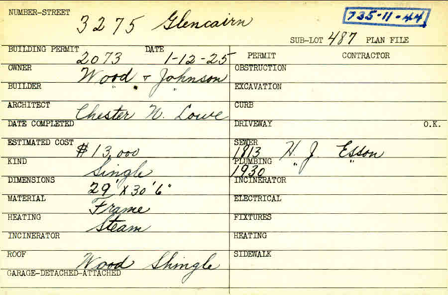 3275 Glencairn Road Shaker Heights, OH 44122 PARCEL ID: 735-11-044 Building Permit Date: 01-12-1925 Plan File Number: 12033 Microfilm Roll: NewRoll#10 Neighborhood: Fernway Owner: Wood and Johnson Builder: Wood and Johnson Architect: Lowe, Chester N. Estimated Cost: 13000 Kind: Single, Single Residence or Dwelling Material: Frame Heating: Steam Roof: Wood Shingle |