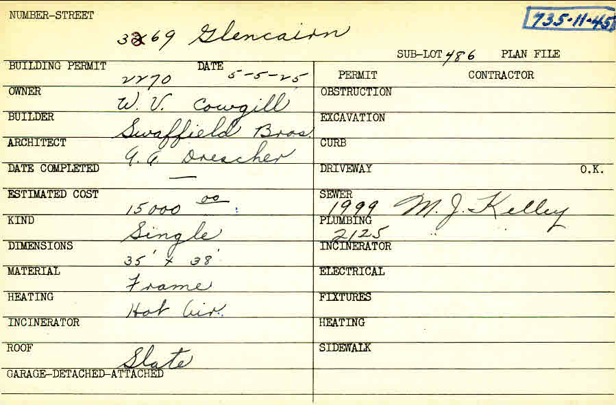 3269 Glencairn Road Shaker Heights, OH 44122 PARCEL ID: 735-11-045 Building Permit Date: 05-05-1925 Plan File Number: 11759 Microfilm Roll: NewRoll#9 Owner: Cowgill, W. V. Builder: Swaffield Brothers Architect: Drescher, A. A. Estimated Cost: 15000 Kind: Single, Single Residence or Dwelling Material: Frame Heating: Hot Air Roof: Slate Blueprints: online, see link above |
