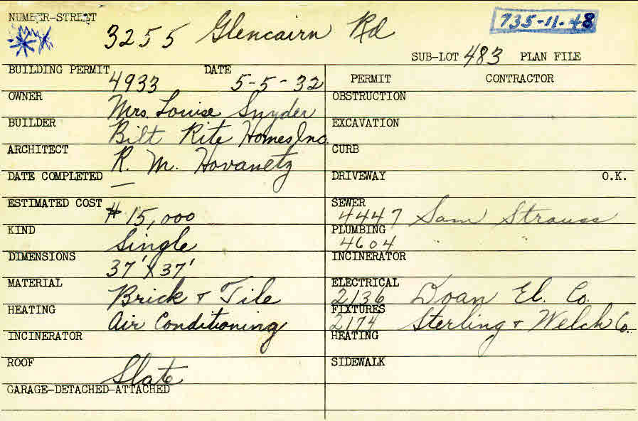 3255 Glencairn Road Shaker Heights, OH 44122 PARCEL ID: 735-11-048 Building Permit Date: 05-05-1932 Plan File Number: 0 Neighborhood: Fernway Owner: Snyder, Mrs. Louise Builder: Bilt Rite Homes Company Architect: Hovanetz, R. M. Estimated Cost: 15000 Kind: Single, Single Residence or Dwelling Material: Brick and Tile Heating: Air Conditioned Roof: Slate |