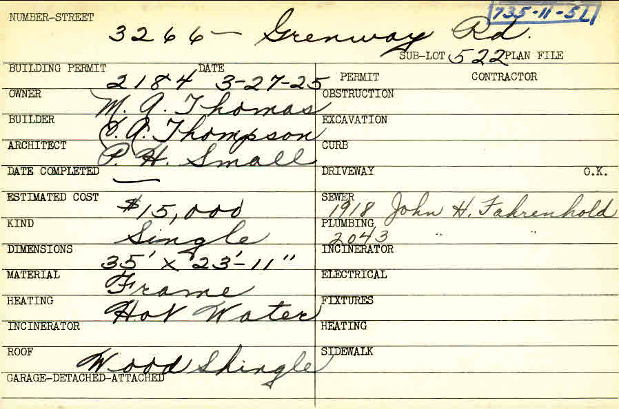3266 Grenway Road Shaker Heights, OH 44122 PARCEL ID: 735-11-051 Building Permit Date: 03-27-1925 Plan File Number: 4229 Microfilm Roll: Roll#61 Neighborhood: Fernway Owner: Thomas, M. A. Builder: Thompson, C. A. Architect: Small, P. H. Estimated Cost: 15000 Kind: Single, Single Residence or Dwelling Material: Frame Heating: Hot Water Roof: Wood Shingle |