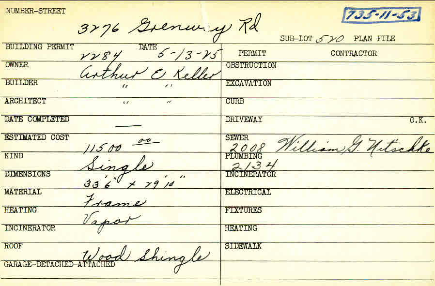 3276 Grenway Road Shaker Heights, OH 44122 PARCEL ID: 735-11-053 Building Permit Date: 05-13-1925 Plan File Number: 6263 Microfilm Roll: Roll#84 Neighborhood: Fernway Owner: Keller, Arthur Emil Builder: Keller, Arthur Emil Architect: Keller, Arthur Emil Estimated Cost: 11500 Kind: Single, Single Residence or Dwelling Material: Frame Heating: Vapor Roof: Wood Shingle |