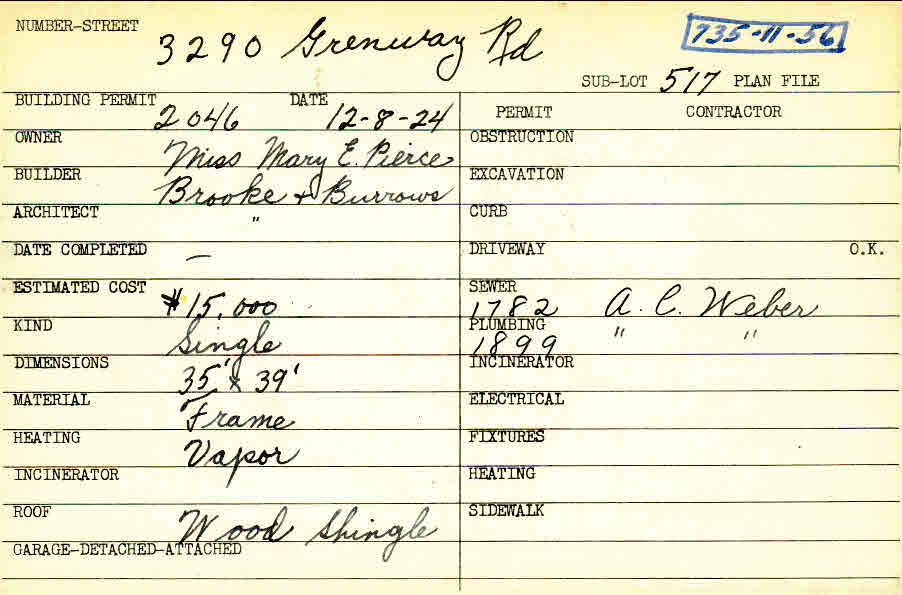3290 Grenway Road Shaker Heights, OH 44122 PARCEL ID: 735-11-056 Building Permit Date: 12-08-1924 Plan File Number: 0 Neighborhood: Fernway Owner: Pierce, Miss Mary E. Builder: Brooke and Burrows Architect: Brooke and Burrows Estimated Cost: 15000 Kind: Single, Single Residence or Dwelling Material: Frame Heating: Vapor Roof: Wood Shingle Card Available: yes |
