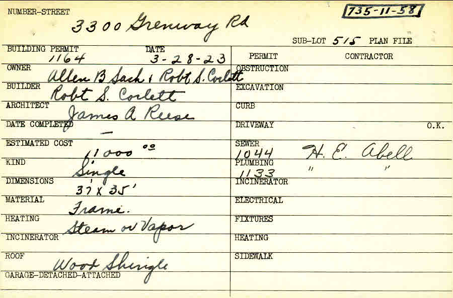 3300 Grenway Road Shaker Heights, OH 44122 PARCEL ID: 735-11-058 Building Permit Date: 03-28-1923 Plan File Number: 0 Neighborhood: Fernway Owner: Sack, Allen B. and Corlett, Robert S. Builder: Corlett, Robert S. Architect: Reese, James A. Estimated Cost: 11000 Kind: Single, Single Residence or Dwelling Material: Frame Heating: Steam Roof: Wood Shingle |