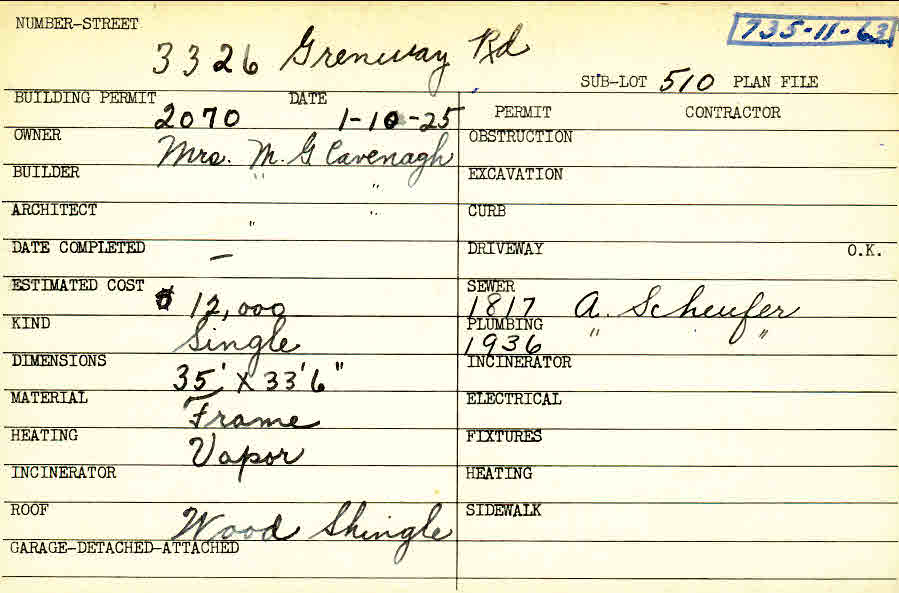 3326 Grenway Road Shaker Heights, OH 44122 PARCEL ID: 735-11-063 Building Permit Date: 01-10-1925 Plan File Number: 0 Neighborhood: Fernway Owner: Cavenagh, Mrs. M. G. Builder: Cavenagh, Mrs. M. G. Architect: Cavenagh, Mrs. M. G. Estimated Cost: 12000 Kind: Single, Single Residence or Dwelling Material: Frame Heating: Vapor Roof: Wood Shingle Card Available: yes |
