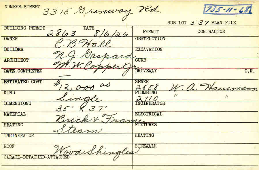 3315 Grenway Road Shaker Heights, OH 44122 PARCEL ID: 735-11-068 Building Permit Date: 08-06-1926 Plan File Number: 0 Neighborhood: Fernway Owner: Hall, C. B. Builder: Gaspard, N. J. Architect: Copper, Munroe Walker Jr. Estimated Cost: 12000 Kind: Single, Single Residence or Dwelling Material: Brick and Frame Heating: Steam Roof: Wood Shingle |