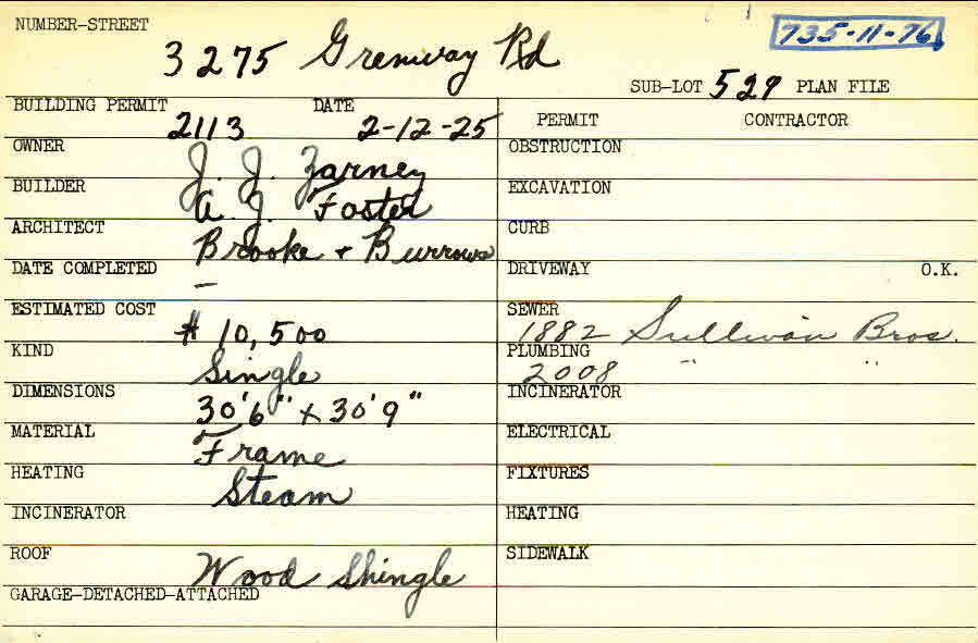 3275 Grenway Road Shaker Heights, OH 44122 PARCEL ID: 735-11-076 Building Permit Date: 02-12-1925 Neighborhood: Fernway Owner: Zarney, J. J. Builder: Foster, A. J. Architect: Brooke and Burrows Estimated Cost: 10500 Kind: Single, Single Residence or Dwelling Material: Frame Heating: Steam Roof: Wood Shingle Blueprints: no blueprints on microfilm |