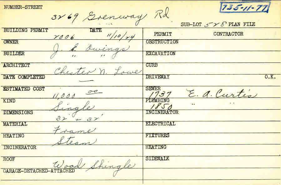 3269 Grenway Road Shaker Heights, OH 44122 PARCEL ID: 735-11-077 Building Permit Date: 11-10-1924 Plan File Number: 0 Neighborhood: Fernway Owner: Owings, J. E. Builder: Owings, J. E. Architect: Lowe, Chester N. Estimated Cost: 11000 Kind: Single, Single Residence or Dwelling Material: Frame Heating: Steam Roof: Wood Shingle Card Available: yes |