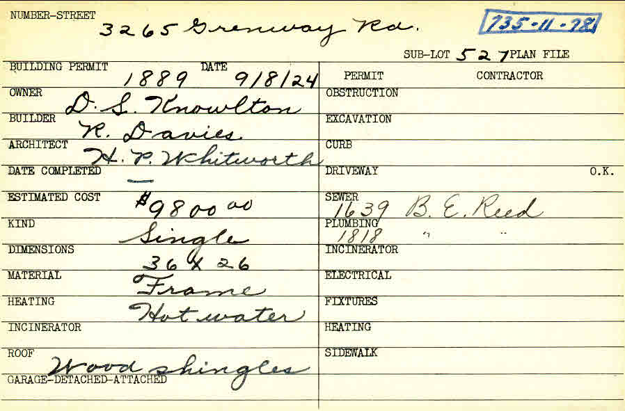 3265 Grenway Road Shaker Heights, OH 44122 PARCEL ID: 735-11-078 Building Permit Date: 09-08-1924 Plan File Number: 0 Neighborhood: Fernway Owner: Knowlton, D. S. Builder: Davies, R. Architect: Whitworth, H. P. Estimated Cost: 9800 Kind: Single, Single Residence or Dwelling Material: Frame Heating: Hot Water Roof: Wood Shingle Card Available: yes |