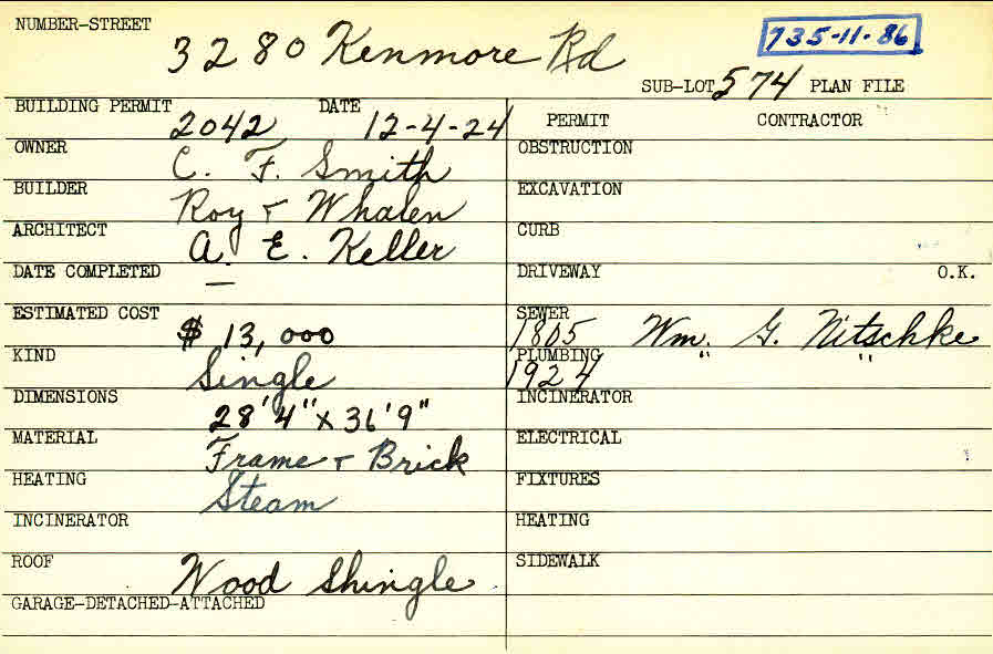 3280 Kenmore Road Shaker Heights, OH 44122 PARCEL ID: 735-11-086 Building Permit Date: 12-04-1924 Plan File Number: 10045 Microfilm Roll: Roll#105 Neighborhood: Fernway Owner: Smith, C. F. Builder: Whalen, Roy T. Architect: Keller, Arthur Emil Estimated Cost: 13000 Kind: Single, Single Residence or Dwelling Material: Frame and Brick Heating: Steam Roof: Wood Shingle |