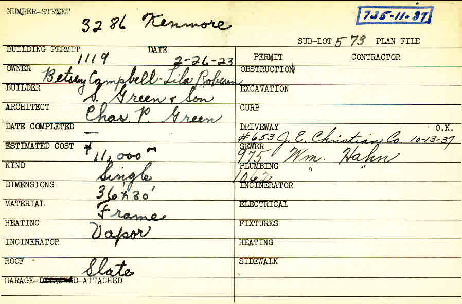 3286 Kenmore Road Shaker Heights, OH 44122 PARCEL ID: 735-11-087 Building Permit Date: 02-26-1923 Plan File Number: 1705 scanned, 6038 Microfilm Roll: Roll026, Roll#80 Neighborhood: Fernway Owner: Campbell, Betsey and Robeson, Lila Builder: S. Green and Son Architect: Green, Charles P. Estimated Cost: 11000 Kind: Single, Single Residence or Dwelling Material: Frame Heating: Vapor Roof: Slate Garage: attached |