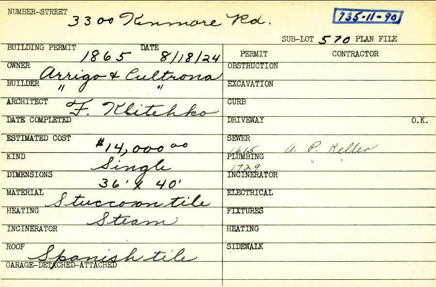 3300 Kenmore Road Shaker Heights, OH 44122 PARCEL ID: 735-11-090 Building Permit Date: 08-18-1924 Plan File Number: 2442 all scanned Microfilm Roll: Roll035 Neighborhood: Fernway Owner: Arrigo and Cultrona Builder: Arrigo and Cultrona Architect: Klitehko, F. Estimated Cost: 14000 Kind: Single, Single Residence or Dwelling Material: Stucco on Tile Heating: Steam Roof: Tile |