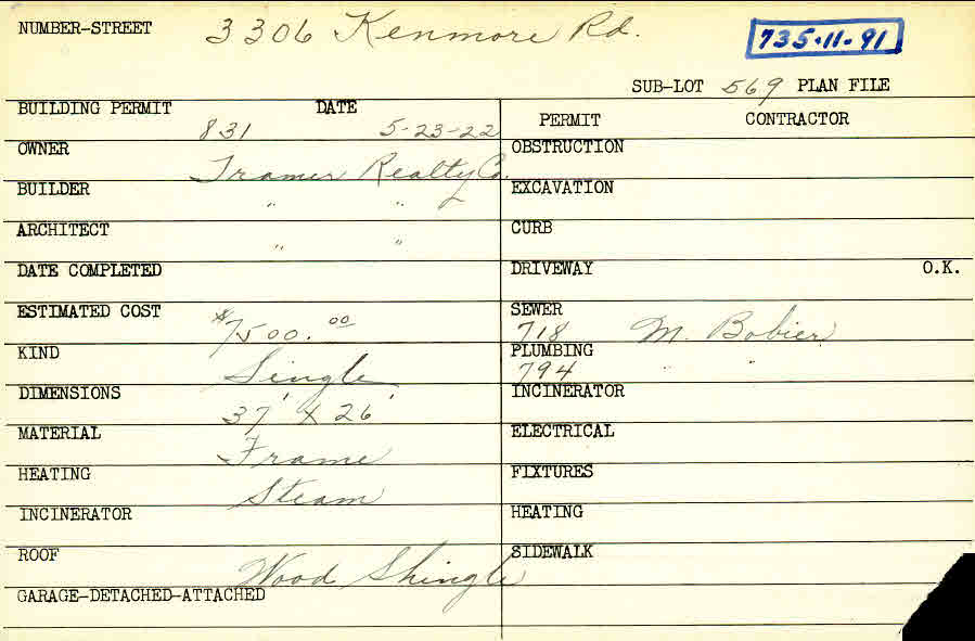 3306 Kenmore Road Shaker Heights, OH 44122 PARCEL ID: 735-11-091 Building Permit Date: 05-23-1922 Plan File Number: 11990 Microfilm Roll: NewRoll#10 Neighborhood: Fernway Owner: Tramer Realty Company Builder: Tramer Realty Company Architect: Tramer Realty Company Estimated Cost: 7500 Kind: Single, Single Residence or Dwelling Material: Frame Heating: Steam Roof: Wood Shingle |