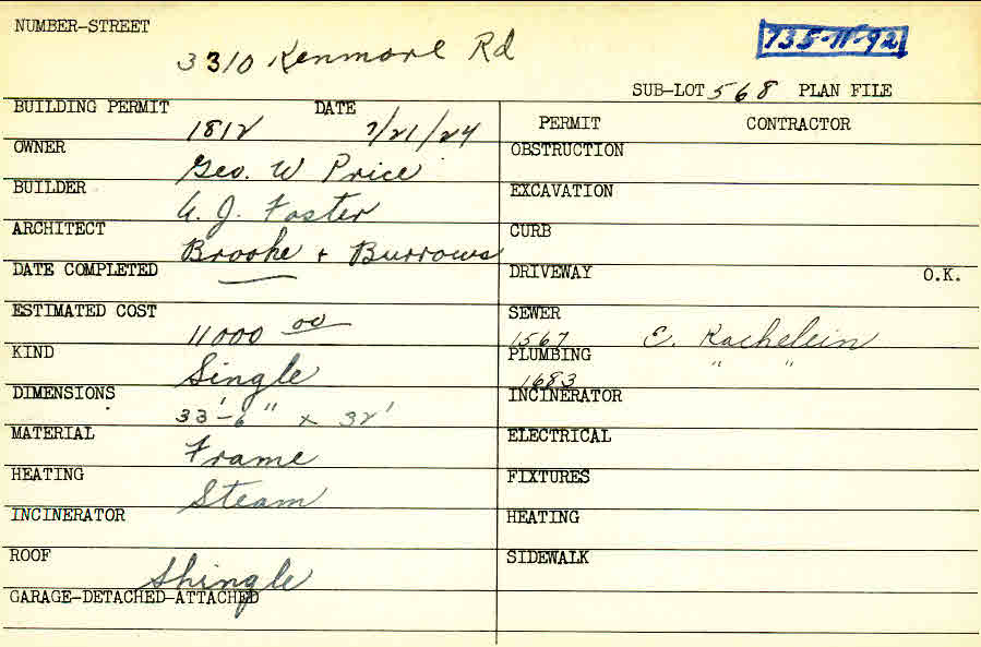 3310 Kenmore Road Shaker Heights, OH 44122 PARCEL ID: 735-11-092 Building Permit Date: 07-21-1924 Plan File Number: 0 Neighborhood: Fernway Owner: Price, George W. Builder: Foster, A. J. Architect: Brooke and Burrows Estimated Cost: 11000 Kind: Single, Single Residence or Dwelling Material: Frame Heating: Steam Roof: Shingles |