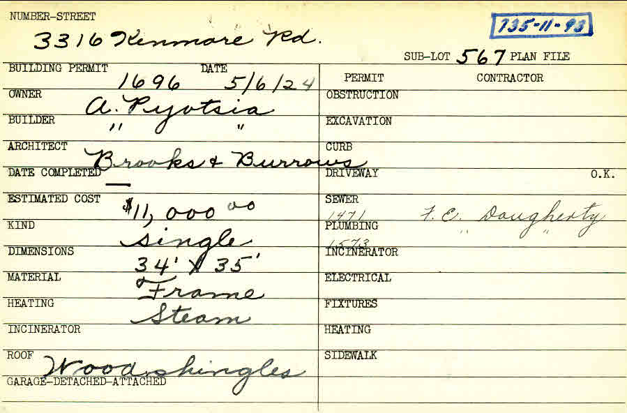 3316 Kenmore Road Shaker Heights, OH 44122 PARCEL ID: 735-11-093 Building Permit Date: 05-06-1924 Plan File Number: 6252 Microfilm Roll: Roll#84 Neighborhood: Fernway Owner: Pyotsia, A. Builder: Pyotsia, A. Architect: Brooke and Burrows Estimated Cost: 11000 Kind: Single, Single Residence or Dwelling Material: Frame Heating: Steam Roof: Wood Shingle |