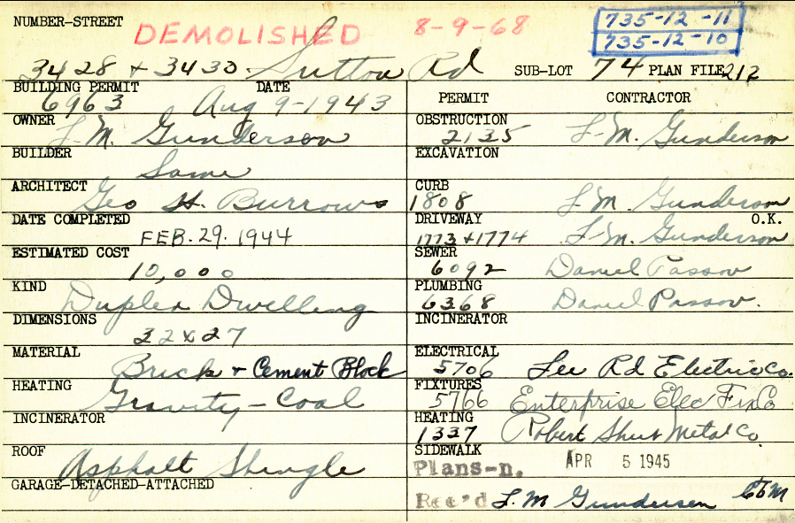 3428 Sutton Road Shaker Heights, OH 44120 PARCEL ID: 735-12-010 Building Permit Date: 08-09-1943 Plan File Number: 21 all scanned Microfilm Roll: Roll001 Neighborhood: Moreland Owner: Gunderson, L. M. Builder: Gunderson, L. M. Architect: Burrows, George H. Estimated Cost: 10000 Date Completed: 02-29-1944 Kind: Duplex or Two-Family Material: Brick and Cement Block Heating: Gravity System Roof: Asphalt Shingles |