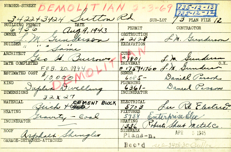 3422 Sutton Road Shaker Heights, OH 44120 PARCEL ID: 735-12-012 Building Permit Date: 08-09-1943 Plan File Number: 38 all scanned Microfilm Roll: Roll001 Neighborhood: Moreland Owner: Gunderson, L. M. Builder: Gunderson, L. M. Architect: Burrows, George H. Estimated Cost: 10000 Date Completed: 02-20-1944 Kind: Duplex or Two-Family Material: Brick and Cement Block Heating: Gravity System Roof: Asphalt Shingles |