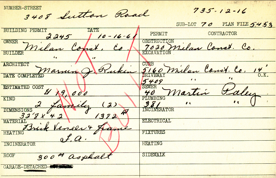 3408 Sutton Road Shaker Heights, OH 44120 PARCEL ID: 735-12-016 Building Permit Date: 10-16-1961 Plan File Number: 5453 Microfilm Roll: Roll#74 Neighborhood: Moreland Owner: Milan Construction Company Builder: Milan Construction Company Architect: Rukin, Marvin J. Estimated Cost: 19000 Kind: Duplex or Two-Family Material: Brick Veneer and Frame Heating: Forced Air Roof: Asphalt Garage: detached |