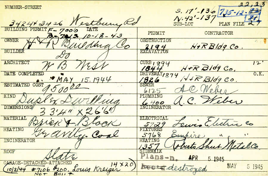 3424 Westbury Road Shaker Heights, OH 44120 PARCEL ID: 735-12-022 Building Permit Date: 10-18-1943 Plan File Number: 27 Neighborhood: Moreland Owner: H and R Building Company Builder: H and R Building Company Architect: West, W. B. Estimated Cost: 9500 Date Completed: 05-15-1944 Kind: Duplex or Two-Family Material: Brick and Block Heating: Gravity System Roof: Slate Garage: detached |