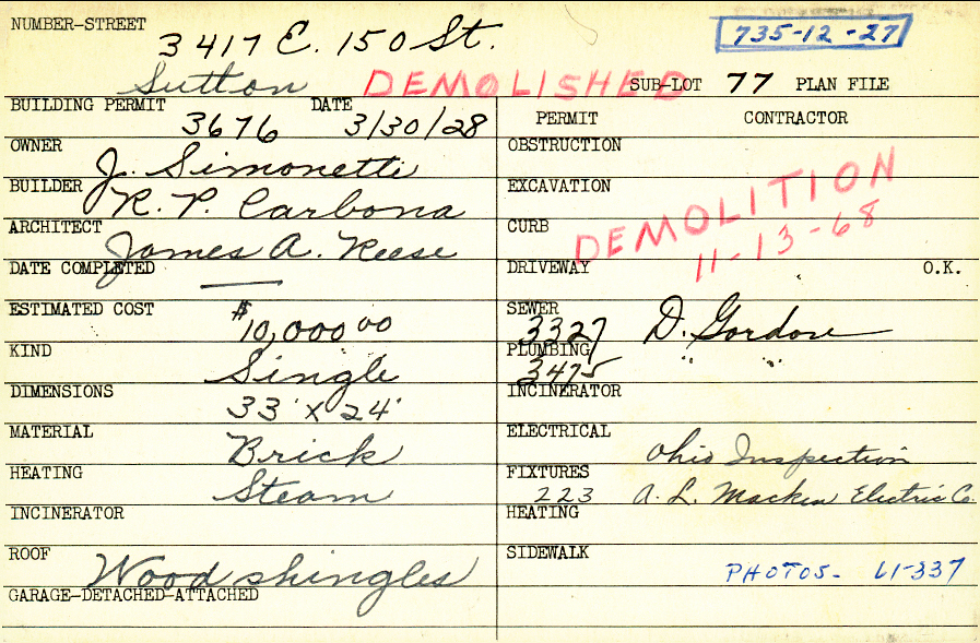 3417 Sutton Road Shaker Heights, OH 44120 PARCEL ID: 735-12-027 Building Permit Date: 03-30-1928 Plan File Number: 0 Neighborhood: Moreland Owner: Simonetti, J. Builder: Carbona, R. P. Architect: Reese, James A. Estimated Cost: 10000 Kind: Single, Single Residence or Dwelling Material: Brick Heating: Steam Roof: Wood Shingle Card Available: yes |