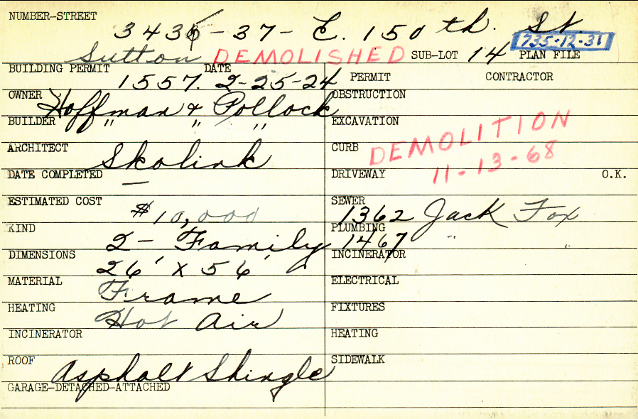 3435 Sutton Road Shaker Heights, OH 44120 PARCEL ID: 735-12-031 Building Permit Date: 02-25-1924 Neighborhood: Moreland Owner: Hoffman and Pollock Builder: Hoffman and Pollock Architect: Skolnik, Louis Estimated Cost: 10000 Kind: Duplex or Two-Family Material: Frame Heating: Hot Air Roof: Asphalt Shingles Blueprints: no blueprints on microfilm |