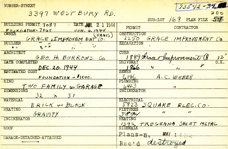 3397 Westbury Road Shaker Heights, OH 44120 PARCEL ID: 735-12-034 Building Permit Date: 06-06-1944 Neighborhood: Moreland Owner: Grace Improvement Company (Vanis) Builder: Grace Improvement Company (Vanis) Architect: George H. Burrows Company Date Completed: 12-20-1944 Kind: Duplex or Two-Family and Garage Material: Brick and Block Heating: Gravity System Garage: detached Blueprints: no blueprints on microfilm |