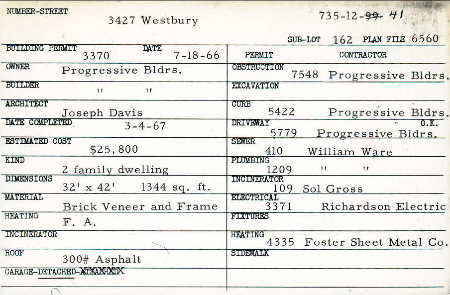 3427 Westbury Road Shaker Heights, OH 44120 PARCEL ID: 735-12-041 Building Permit Date: 07-18-1966 Plan File Number: 6560 Microfilm Roll: Roll#86 Neighborhood: Moreland Owner: Progressive Builders Builder: Progressive Builders Architect: Davis, Joseph Estimated Cost: 25800 Date Completed: 03-04-1967 Kind: Duplex or Two-Family Material: Brick Veneer and Frame Heating: Forced Air Roof: 300# Min Asphalt Garage: detached |