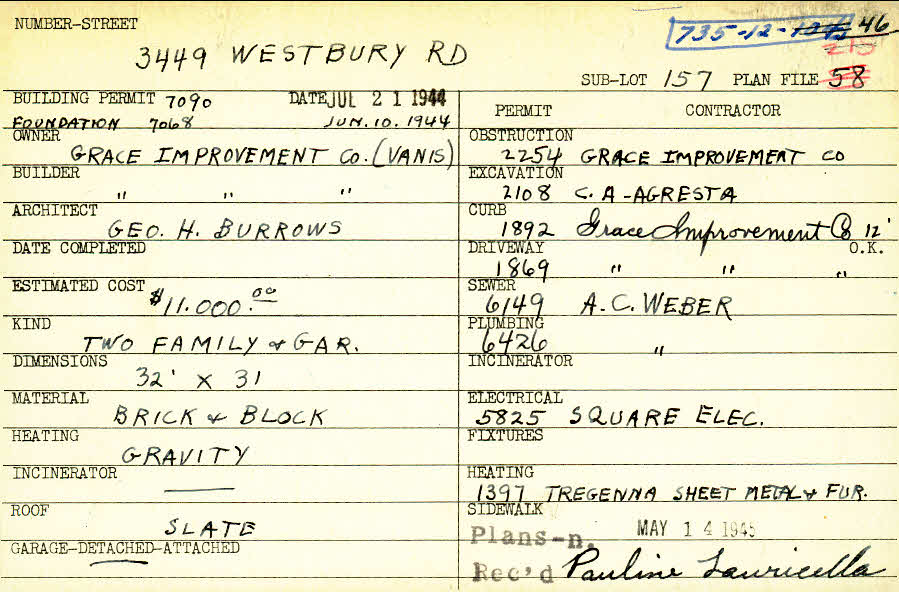 3449 Westbury Road Shaker Heights, OH 44120 PARCEL ID: 735-12-046 Building Permit Date: 06-10-1944 Plan File Number: 32 scanned, 210, 7284 Microfilm Roll: Roll001, Roll#92 Neighborhood: Moreland Owner: Grace Improvement Company (Vanis) Builder: Grace Improvement Company (Vanis) Architect: Burrows, George H. Estimated Cost: 11000 Kind: Duplex or Two-Family and Garage Material: Brick and Block Heating: Gravity System Roof: Slate Garage: detached |