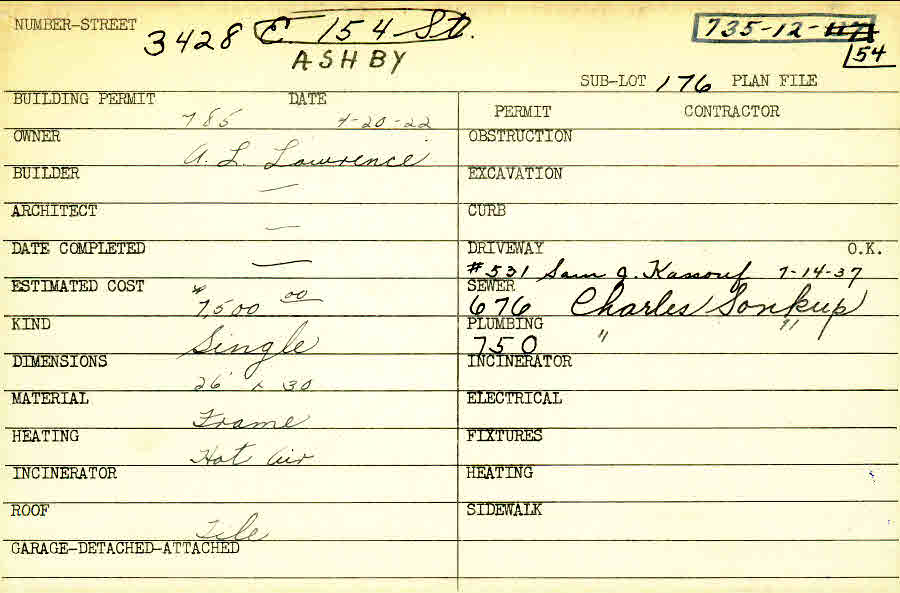 3428 Ashby Road Shaker Heights, OH 44120 PARCEL ID: 735-12-054 Building Permit Date: 04-20-1922 Neighborhood: Moreland Owner: Lawrence, A. L. Builder: Lawrence, A. L. Architect: Lawrence, A. L. Estimated Cost: 7500 Kind: Single, Single Residence or Dwelling Material: Frame Heating: Hot Air Roof: Tile Blueprints: no blueprints on microfilm |