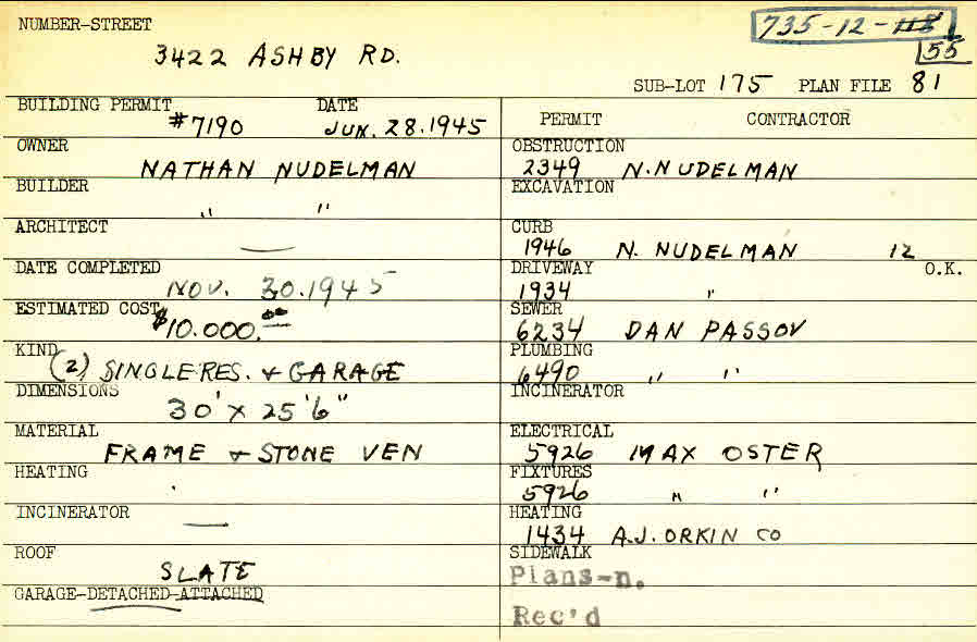 3422 Ashby Road Shaker Heights, OH 44120 PARCEL ID: 735-12-055 Building Permit Date: 06-28-1945 Plan File Number: 81 all scanned Microfilm Roll: Roll001 Neighborhood: Moreland Owner: Nudelman, Nathan Builder: Nudelman, Nathan Estimated Cost: 10000 Date Completed: 11-30-1945 Kind: Single Dwelling and Garage (2) Material: Frame and Stone Veneer Roof: Slate Garage: detached |