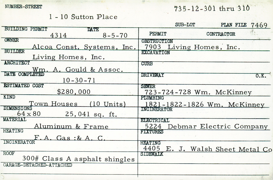 2 Sutton Place Shaker Heights, OH 44120 PARCEL ID: 735-12-302 Building Permit Date: 08-05-1970 Plan File Number: 7469 all scanned Microfilm Roll: Roll093 Neighborhood: Moreland Owner: Alcoa Construction Systems, Inc. Builder: Living Homes, Inc. Architect: William A. Gould and Associates Estimated Cost: 280000 Date Completed: 10-30-1971 Kind: Apartment or Multi-family (3+) Material: Aluminum and Frame Heating: Forced Air - Gas Roof: Asphalt Shingles Blueprints: online, see link above |