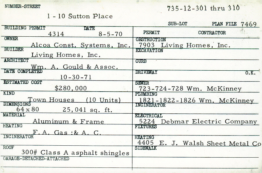 3 Sutton Place Shaker Heights, OH 44120 PARCEL ID: 735-12-303 Building Permit Date: 08-05-1970 Plan File Number: 7469 all scanned Microfilm Roll: Roll093 Neighborhood: Moreland Owner: Alcoa Construction Systems, Inc. Builder: Living Homes, Inc. Architect: William A. Gould and Associates Estimated Cost: 280000 Date Completed: 10-30-1971 Kind: Apartment or Multi-family (3+) Material: Aluminum and Frame Heating: Forced Air - Gas Roof: Asphalt Shingles Blueprints: online, see link above |