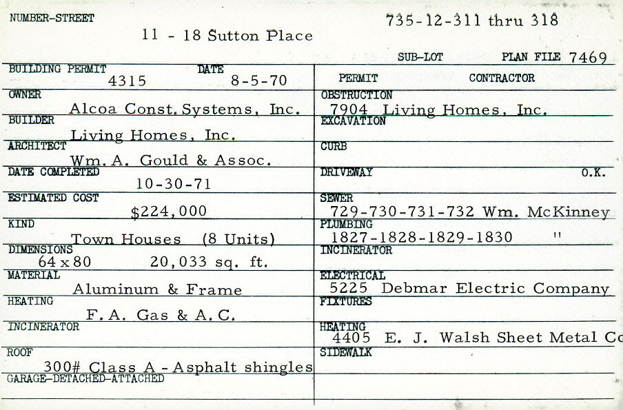 15 Sutton Place Shaker Heights, OH 44120 PARCEL ID: 735-12-315 Building Permit Date: 08-05-1970 Plan File Number: 7469 all scanned Microfilm Roll: Roll093 Neighborhood: Moreland Owner: Alcoa Construction Systems, Inc. Builder: Living Homes, Inc. Architect: William A. Gould and Associates Estimated Cost: 224000 Date Completed: 10-30-1971 Kind: Apartment or Multi-family (3+) Material: Aluminum and Frame Heating: Forced Air - Gas Roof: Asphalt Shingles Blueprints: online, see link above |