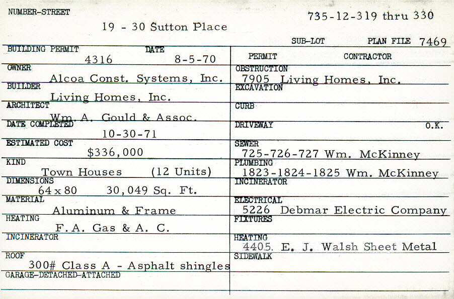 22 Sutton Place Shaker Heights, OH 44120 PARCEL ID: 735-12-322 Building Permit Date: 08-05-1970 Plan File Number: 7469 all scanned Microfilm Roll: Roll093 Neighborhood: Moreland Owner: Alcoa Construction Systems, Inc. Builder: Living Homes, Inc. Architect: William A. Gould and Associates Estimated Cost: 336000 Date Completed: 10-30-1971 Kind: Apartment or Multi-family (3+) Material: Aluminum and Frame Heating: Forced Air - Gas Roof: Asphalt Shingles Blueprints: online, see link above |