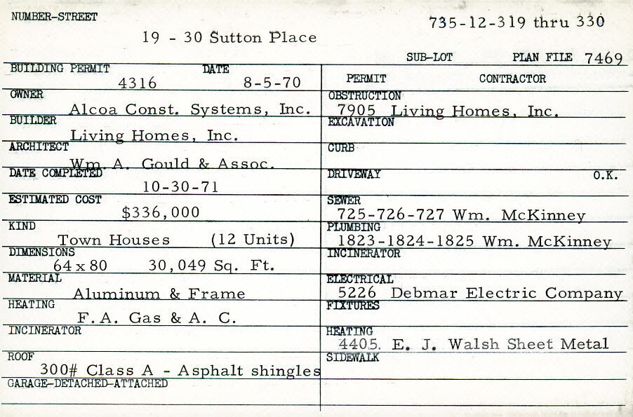 26 Sutton Place Shaker Heights, OH 44120 PARCEL ID: 735-12-326 Building Permit Date: 08-05-1970 Plan File Number: 7469 all scanned Microfilm Roll: Roll093 Neighborhood: Moreland Owner: Alcoa Construction Systems, Inc. Builder: Living Homes, Inc. Architect: William A. Gould and Associates Estimated Cost: 336000 Date Completed: 10-30-1971 Kind: Apartment or Multi-family (3+) Material: Aluminum and Frame Heating: Forced Air - Gas Roof: Asphalt Shingles Blueprints: online, see link above |