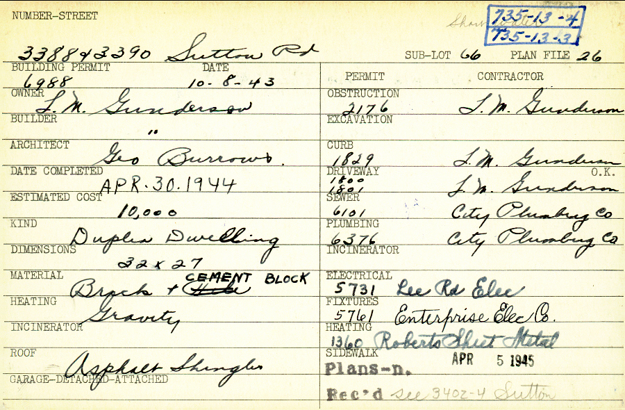 3388 Sutton Road Shaker Heights, OH 44120 PARCEL ID: 735-13-004 Building Permit Date: 10-08-1943 Plan File Number: 623 all scanned Microfilm Roll: Roll008 Neighborhood: Moreland Owner: Gunderson, L. M. Builder: Gunderson, L. M. Architect: Burrows, George Estimated Cost: 10000 Date Completed: 04-30-1944 Kind: Duplex or Two-Family Material: Brick and Cement Block Heating: Gravity System Roof: Asphalt Shingles |