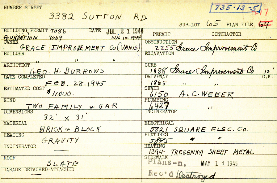 3382 Sutton Road Shaker Heights, OH 44120 PARCEL ID: 735-13-005 Building Permit Date: 06-10-1944 Plan File Number: 217 Neighborhood: Moreland Owner: Grace Improvement Company (Vanis) Builder: Grace Improvement Company (Vanis) Architect: Burrows, George H. Estimated Cost: 11000 Date Completed: 02-28-1945 Kind: Duplex or Two-Family and Garage Material: Brick and Block Heating: Gravity System Roof: Slate Garage: detached Card Available: yes |