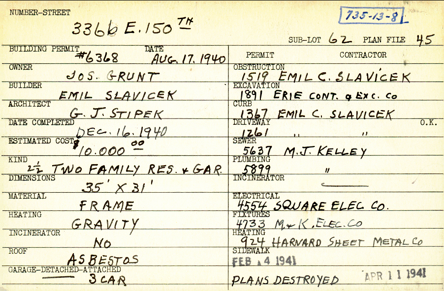 3366 Sutton Road Shaker Heights, OH 44120 PARCEL ID: 735-13-008 Building Permit Date: 08-17-1940 Plan File Number: 45 Neighborhood: Moreland Owner: Grunt, Joseph Builder: Slavicek, Emil Architect: Stipek, G. J. Estimated Cost: 10000 Date Completed: 12-16-1940 Kind: Duplex or Two-Family and Garage Material: Frame Heating: Gravity System Roof: Asbestos Garage: detached 3 car Card Available: yes |