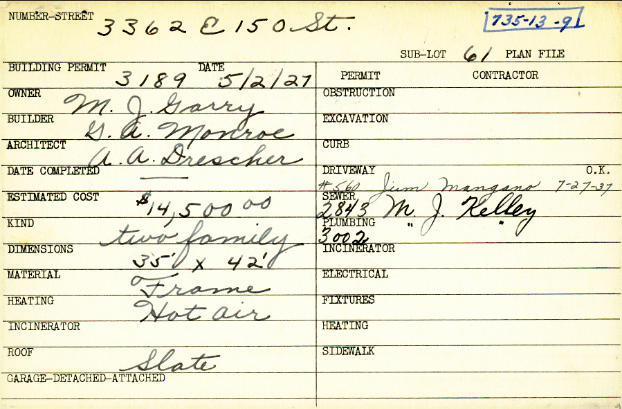 3362 Sutton Road Shaker Heights, OH 44120 PARCEL ID: 735-13-009 Building Permit Date: 05-02-1927 Plan File Number: 6303, 6364 Microfilm Roll: Roll#85 Neighborhood: Moreland Owner: Garry, M. J. Builder: Monroe, G. A. Architect: Drescher, A. A. Estimated Cost: 14500 Kind: Duplex or Two-Family Material: Frame Heating: Hot Air Roof: Slate |