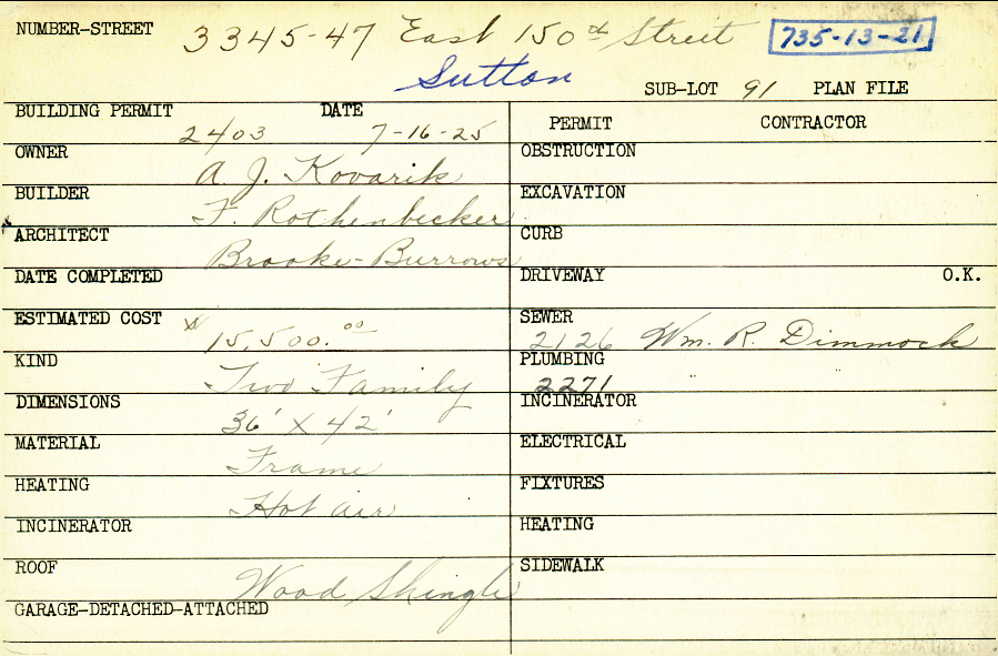 3345 Sutton Road Shaker Heights, OH 44120 PARCEL ID: 735-13-021 Building Permit Date: 07-16-1925 Plan File Number: 0 Neighborhood: Moreland Owner: Kovarik, A. J. Builder: Rothenbecker, F. Architect: Brooke - Burrows Estimated Cost: 15500 Kind: Duplex or Two-Family Material: Frame Heating: Hot Air Roof: Wood Shingle Card Available: yes |