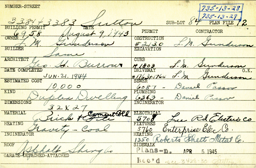 3383 Sutton Road Shaker Heights, OH 44120 PARCEL ID: 735-13-029 Building Permit Date: 08-09-1943 Plan File Number: 12, 4557 Microfilm Roll: Roll#63 Neighborhood: Moreland Owner: Gunderson, L. M. Builder: Gunderson, L. M. Architect: Burrows, George H. Estimated Cost: 10000 Date Completed: 06-21-1944 Kind: Duplex or Two-Family Material: Brick and Cement Block Heating: Gravity System Roof: Asphalt Shingles |